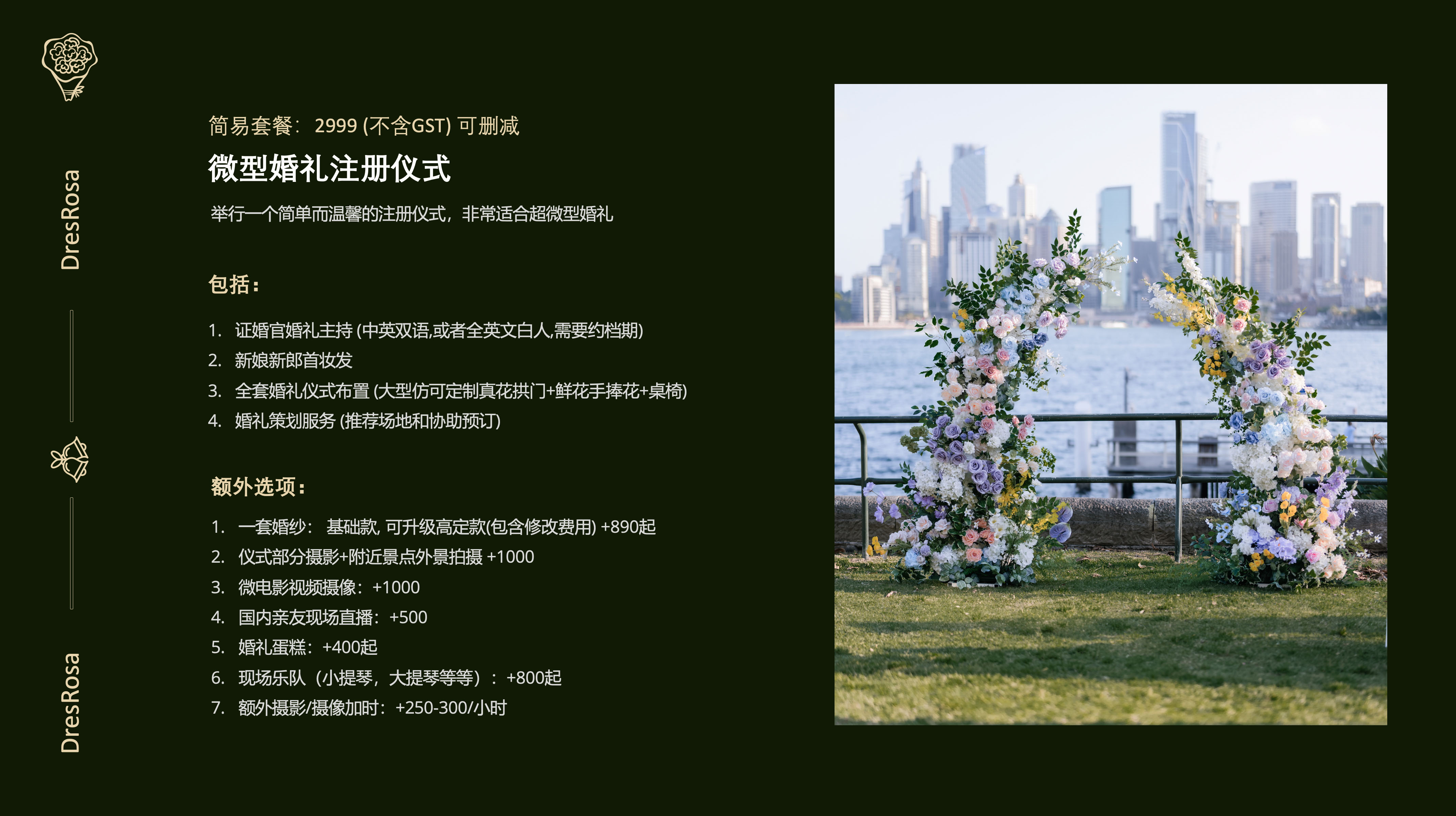 EZ Wedding 成立于2009年,至今已经为超过840对新人完成他们的婚礼注册和登记. 我们不仅提供全悉尼(澳大利亚澳洲雪梨)最优惠的结婚证婚官和婚姻登记注册官, 还提供一站式婚礼婚庆服务.包括化妆,婚纱,摄影,摄像,主持人和现场花艺布置等.